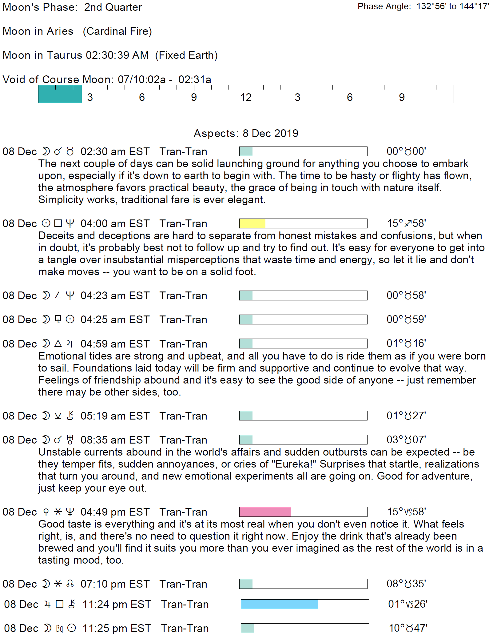 Planet Color Key: The longer the bar, the slower the aspecting planet and the longer the duration of the planet’s transit.