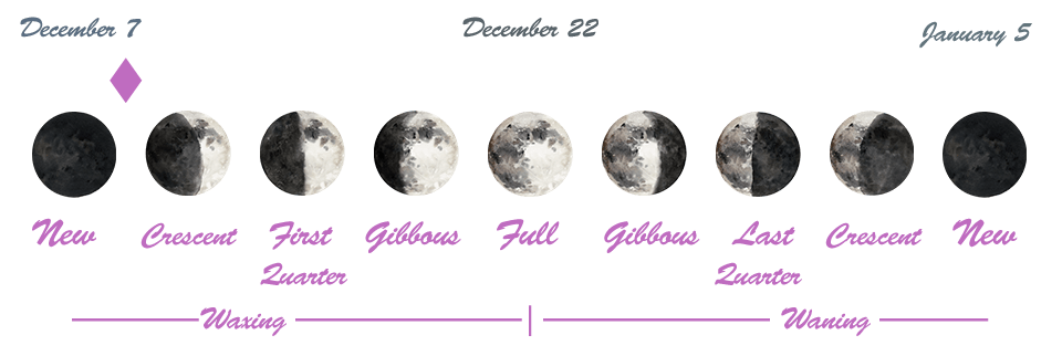 - The New Moon occurred on the 7th in the sign of Sagittarius, and the First Quarter Moon will happen on December 15th.