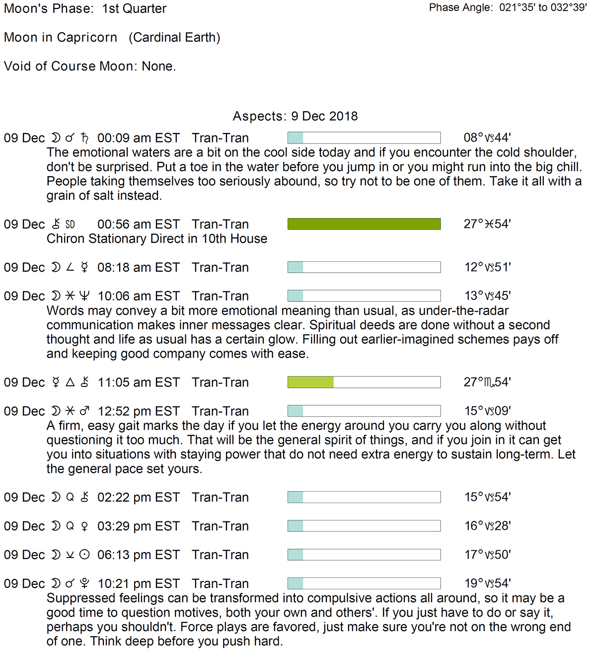 Planet Color Key: The longer the bar, the slower the aspecting planet and the longer the duration of the planet’s transit.