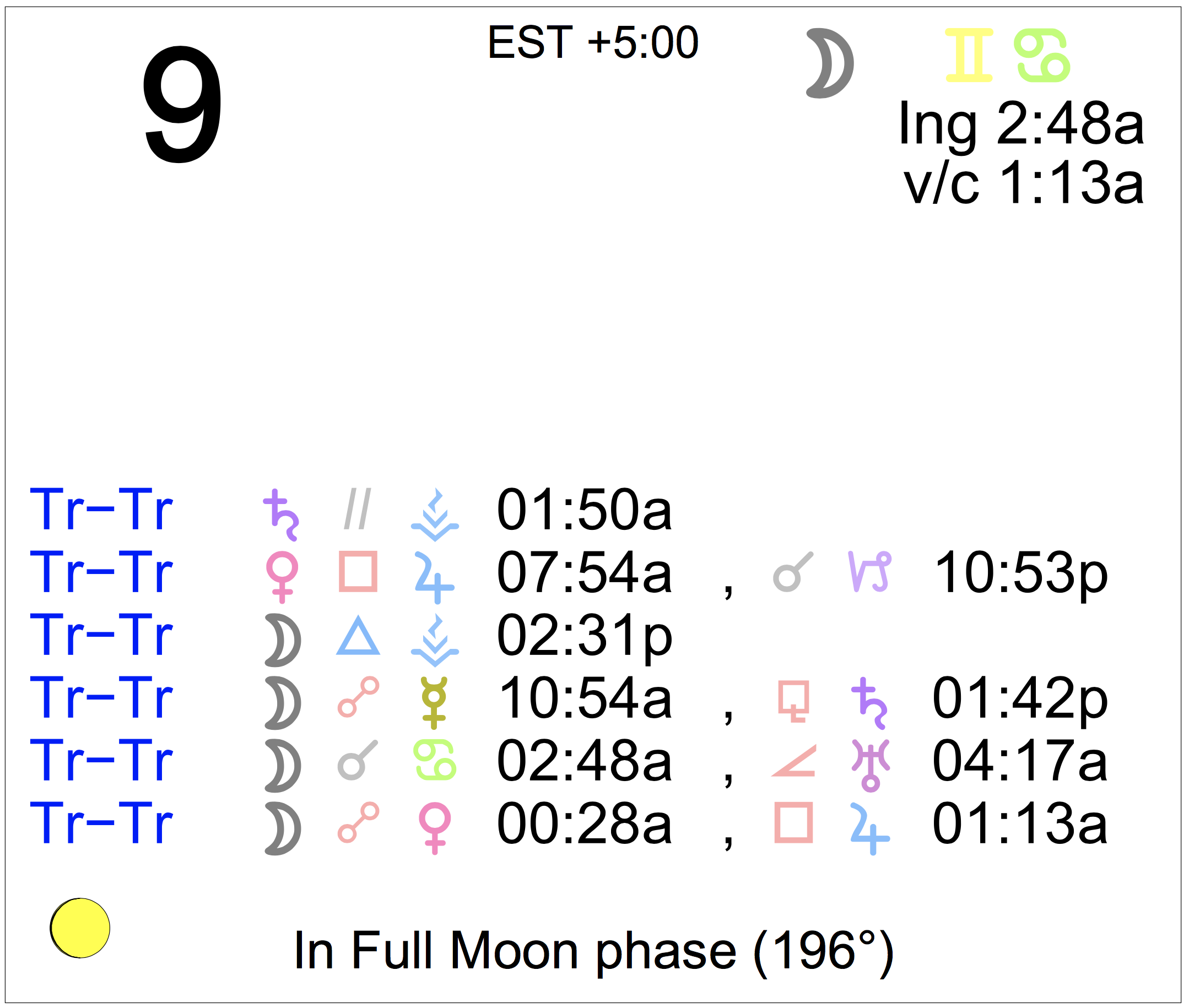 Planet Color Key: The longer the bar, the slower the aspecting planet, and the longer the duration of the planet’s transit.