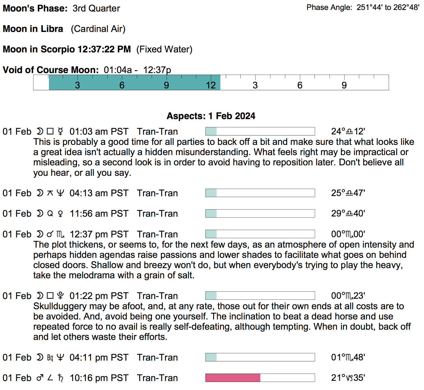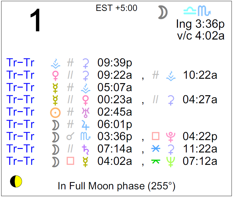 Planet Color Key: The longer the bar, the slower the aspecting planet, and the longer the duration of the planet’s transit.