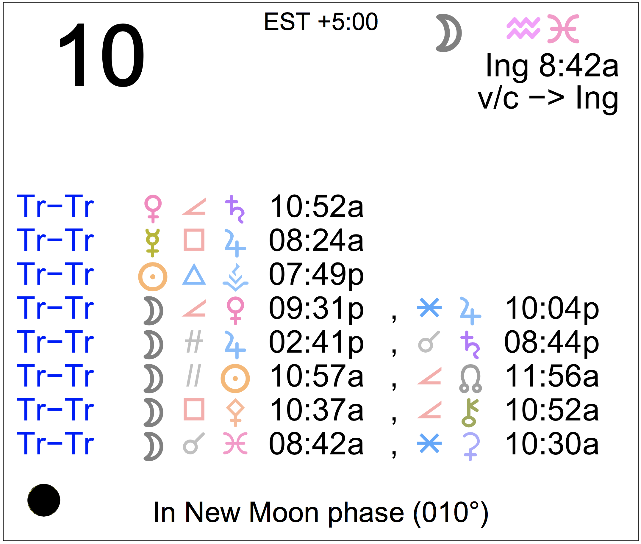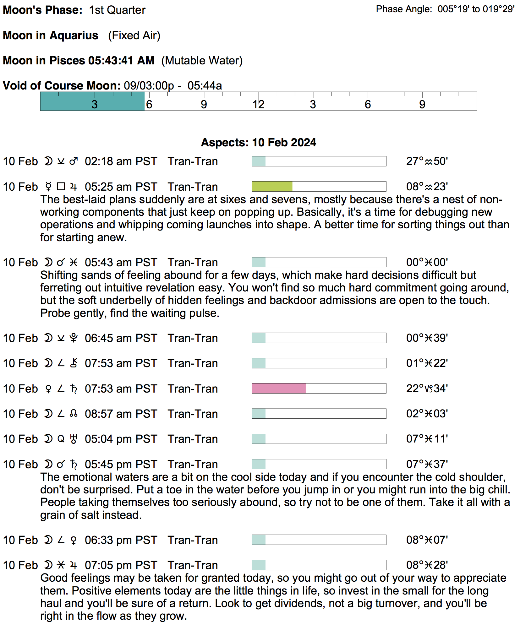 Planet Color Key: The longer the bar, the slower the aspecting planet, and the longer the duration of the planet’s transit.