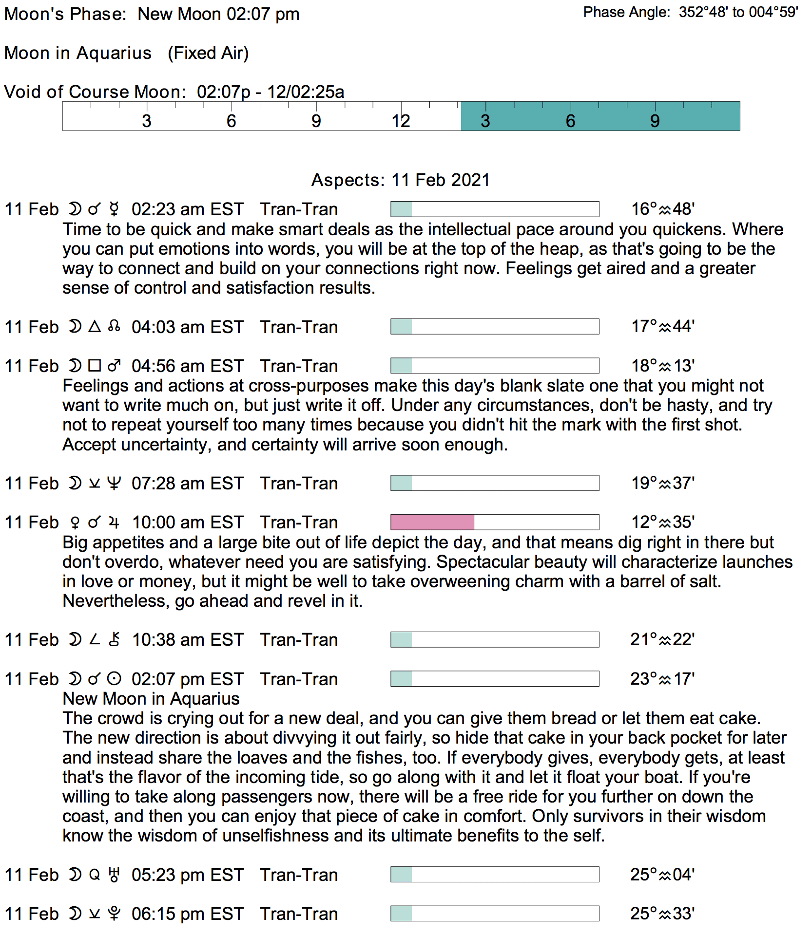 Planet Color Key: The longer the bar, the slower the aspecting planet, and the longer the duration of the planet’s transit.