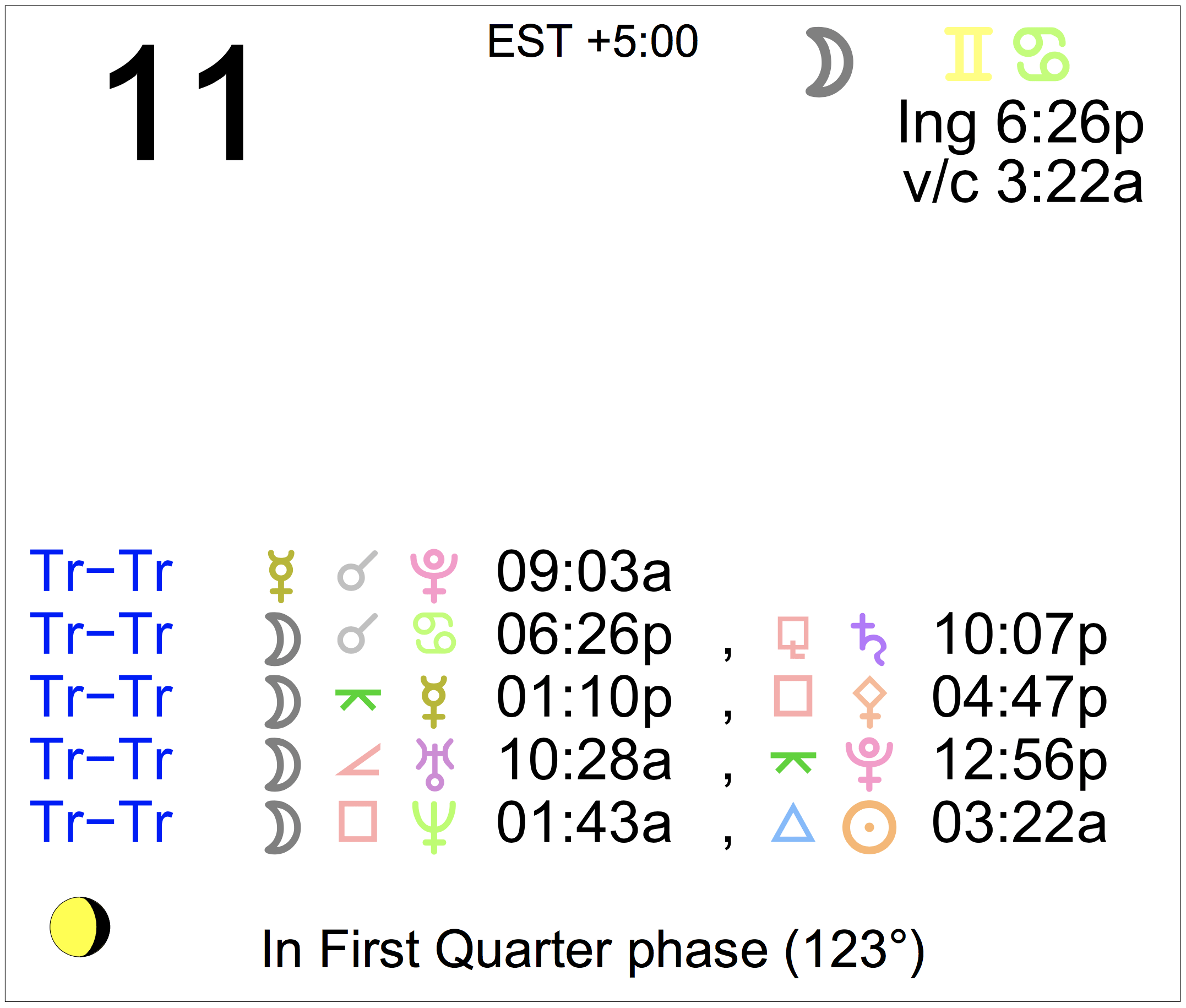 - The Moon is in Gemini until 6:26 PM, after which the Moon is in Cancer.