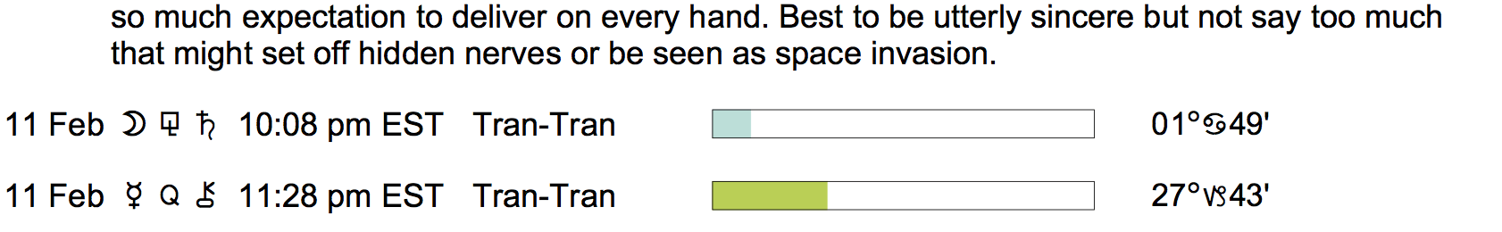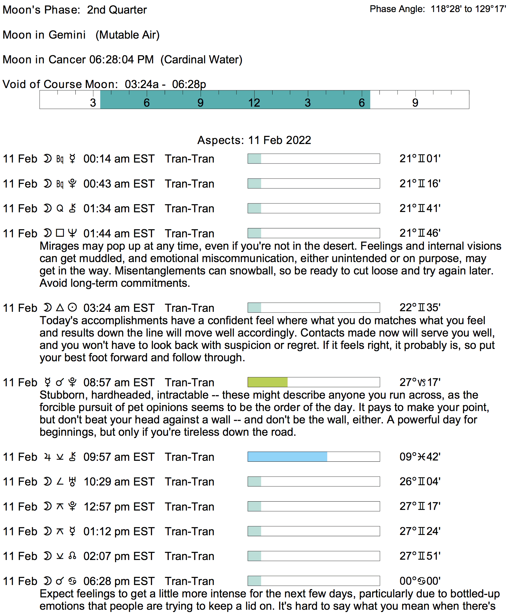 Planet Color Key: The longer the bar, the slower the aspecting planet, and the longer the duration of the planet’s transit.