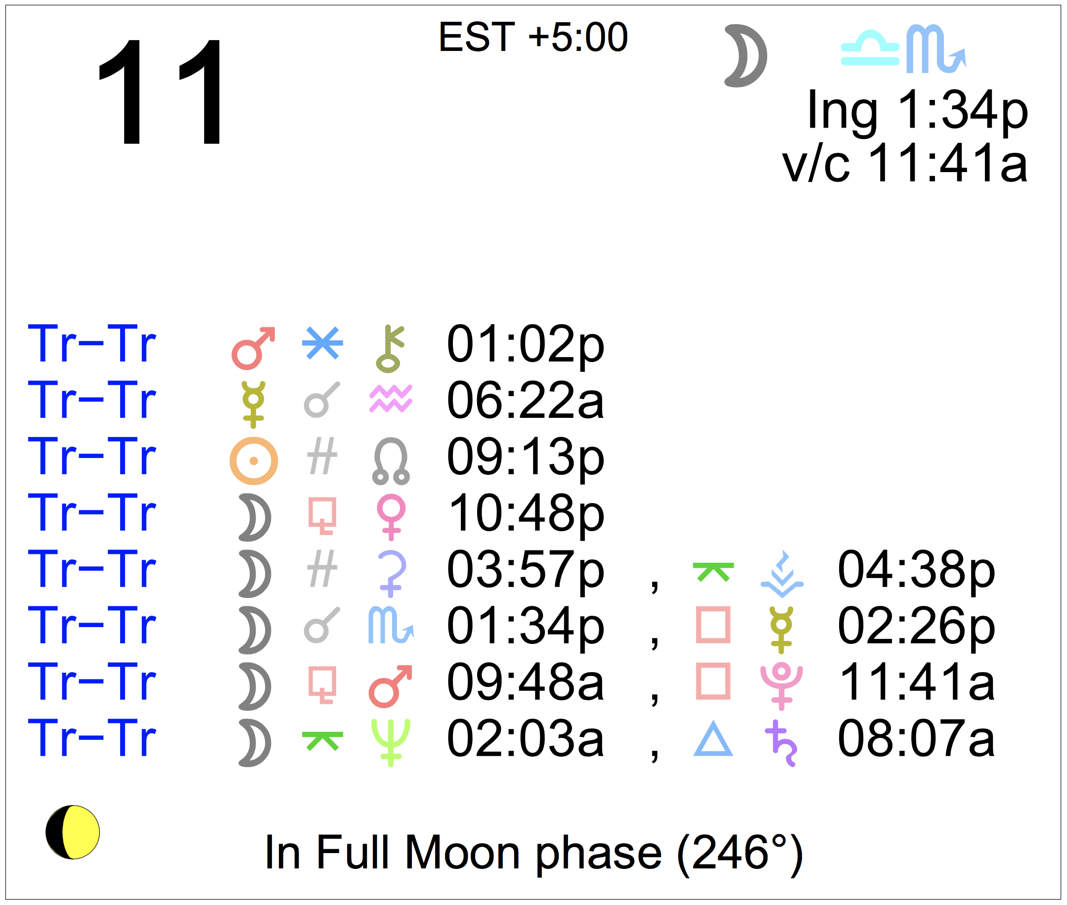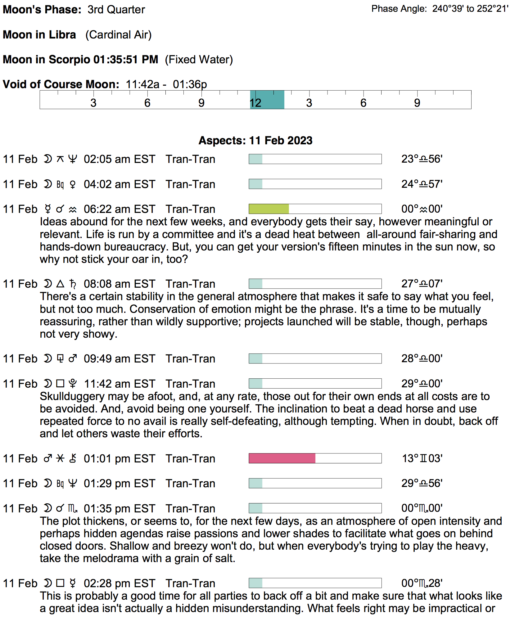 Planet Color Key: The longer the bar, the slower the aspecting planet, and the longer the duration of the planet’s transit.