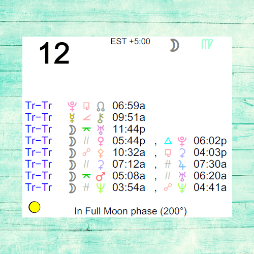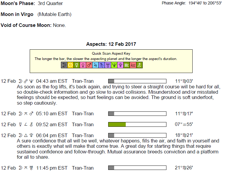 The following aspects (major only) and positions are at noon (EST) on February 12th: