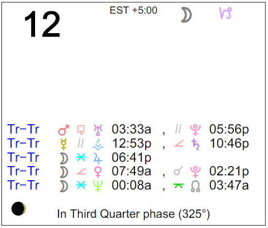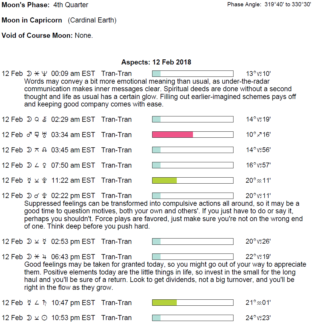 The following aspects (major only) and positions are at noon (EST) on February 12th: