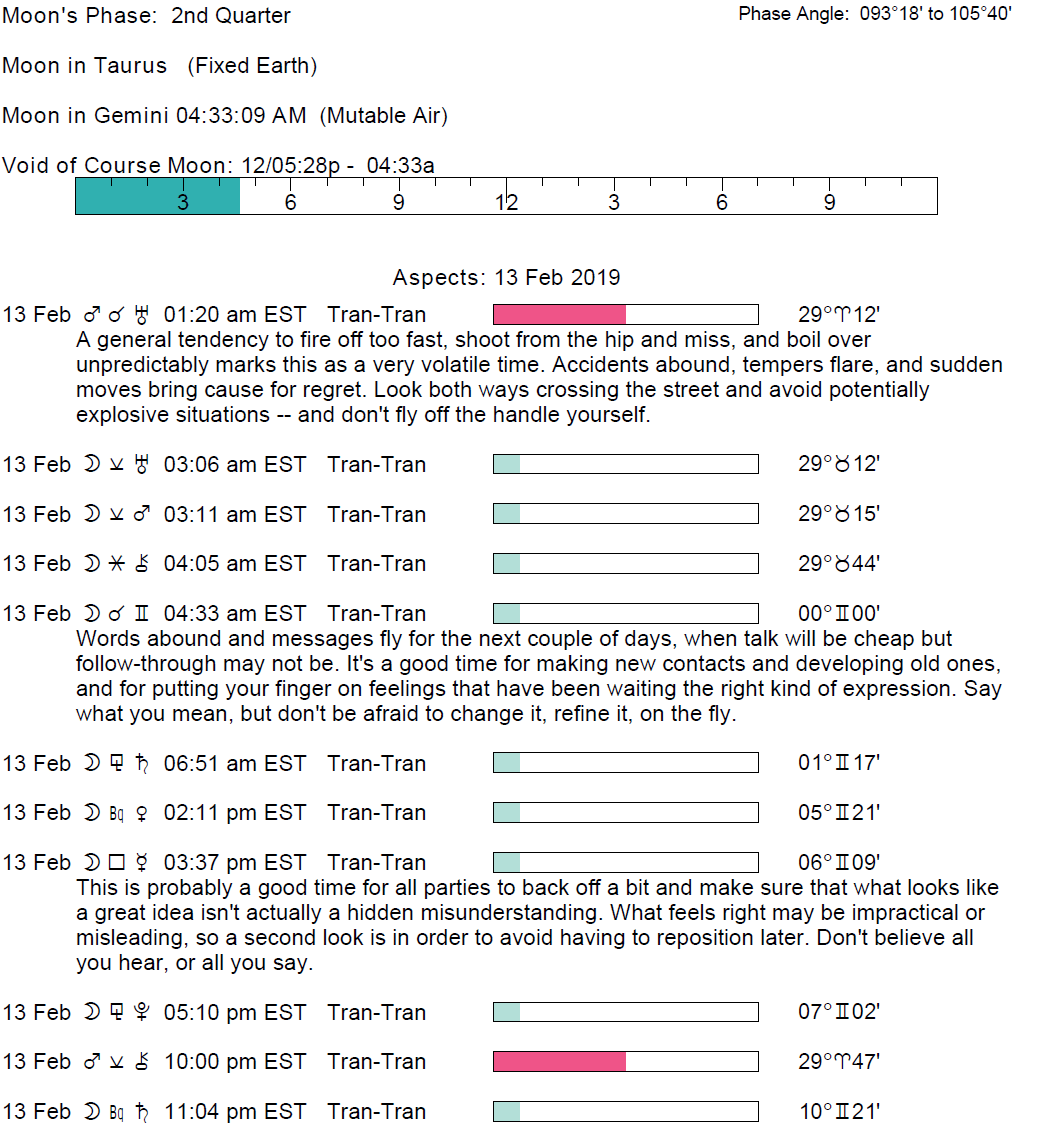 Planet Color Key: The longer the bar, the slower the aspecting planet and the longer the duration of the planet’s transit.