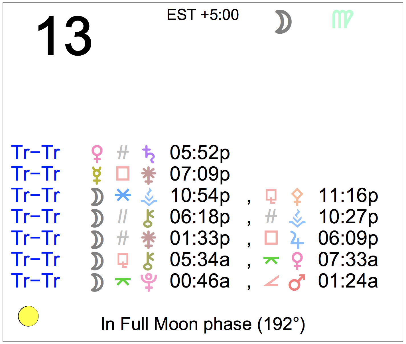 Planet Color Key: The longer the bar, the slower the aspecting planet, and the longer the duration of the planet’s transit.