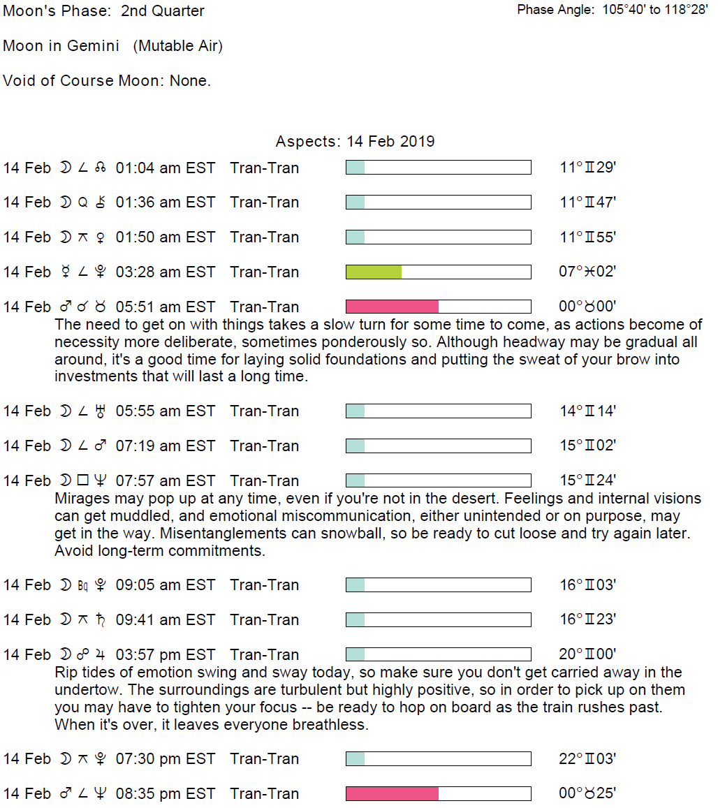 Planet Color Key: The longer the bar, the slower the aspecting planet and the longer the duration of the planet’s transit.