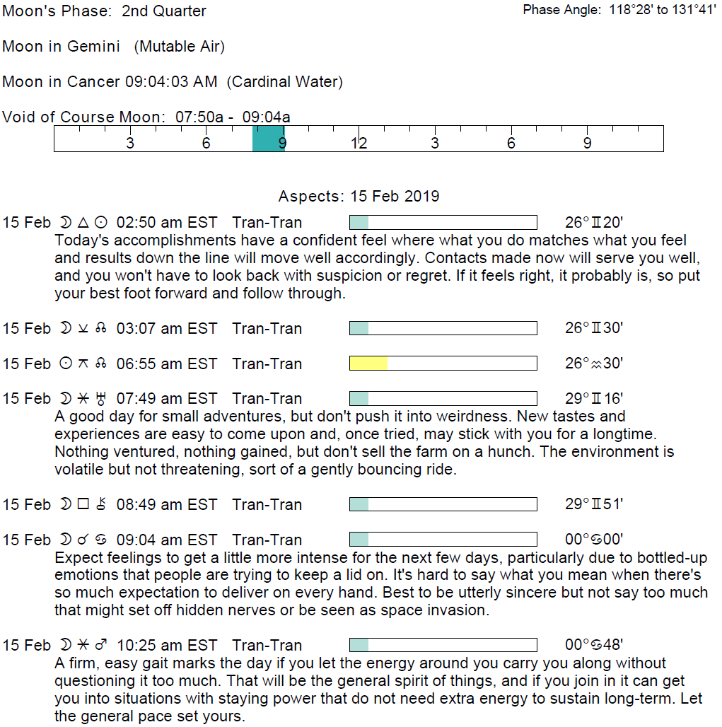 Planet Color Key: The longer the bar, the slower the aspecting planet and the longer the duration of the planet’s transit.