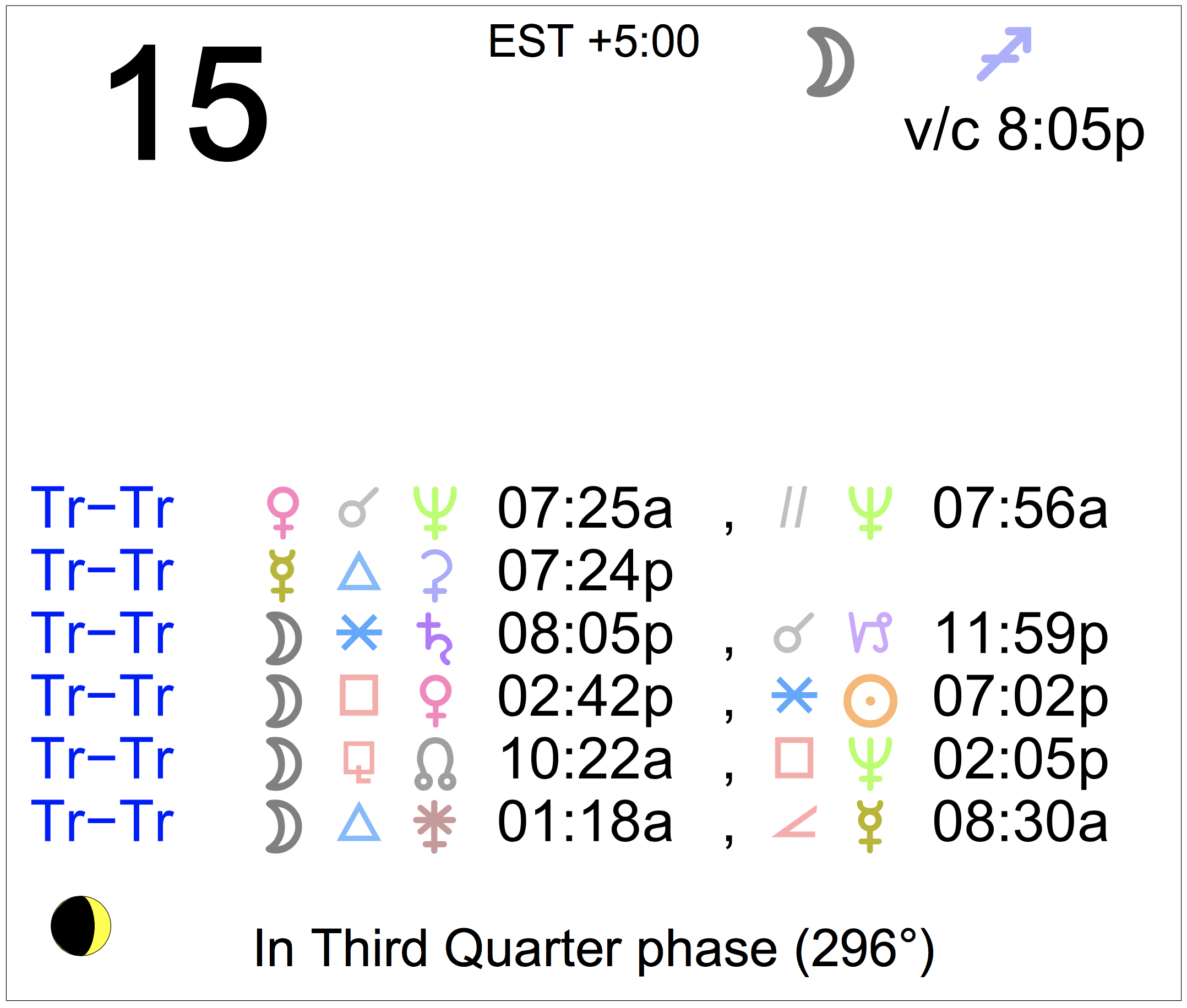 Planet Color Key: The longer the bar, the slower the aspecting planet, and the longer the duration of the planet’s transit.