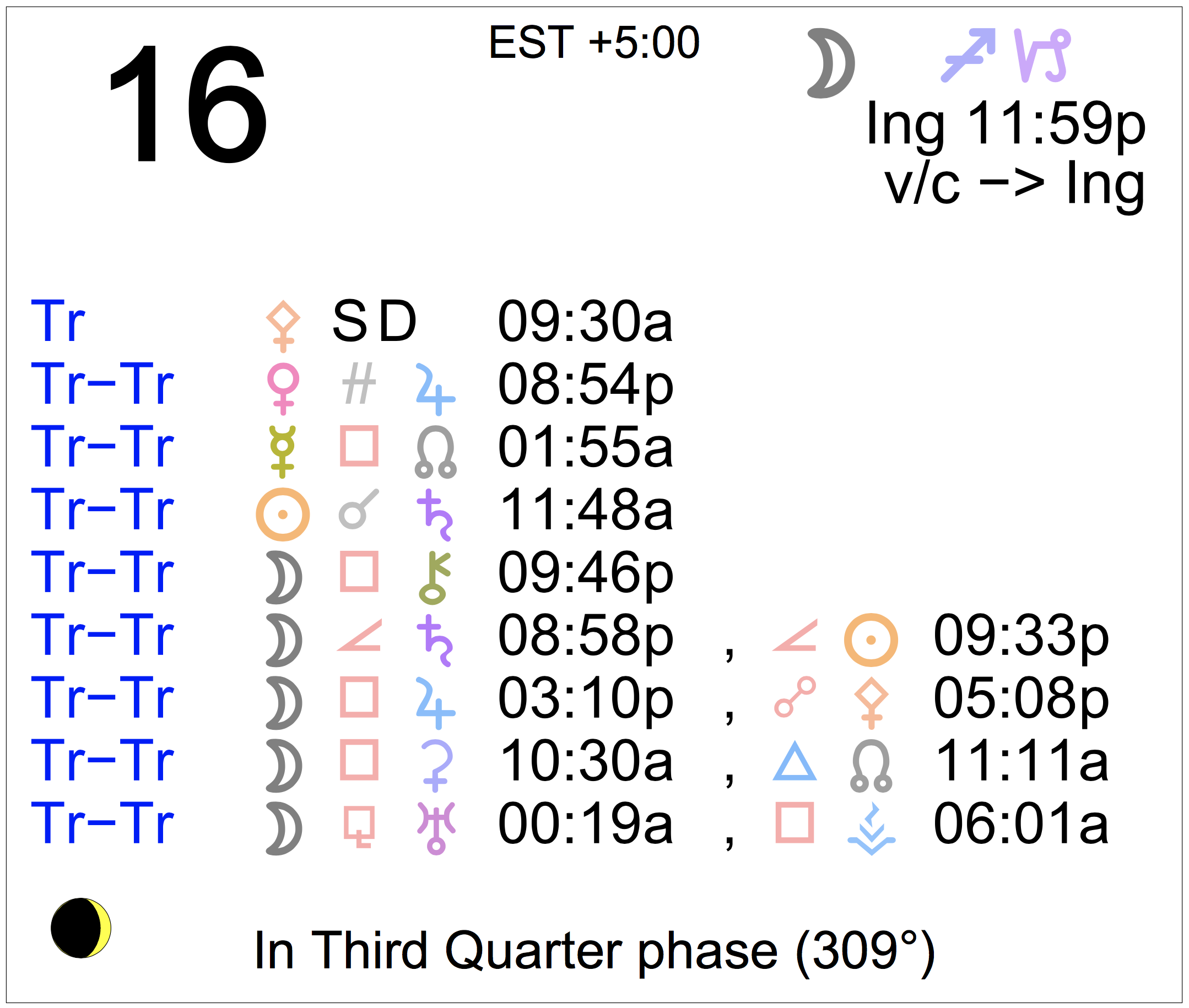 - The Moon is waning and in its Last Quarter phase until 9:33 PM, after which the Moon is in its Waning Crescent phase.