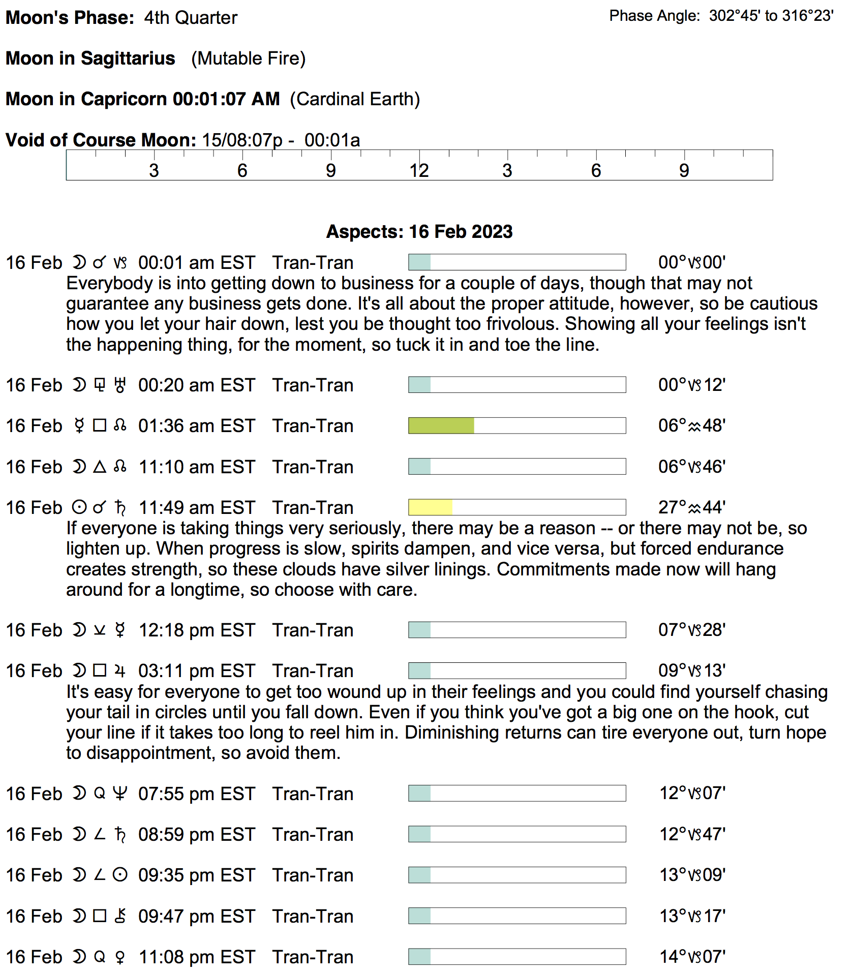 Planet Color Key: The longer the bar, the slower the aspecting planet, and the longer the duration of the planet’s transit.