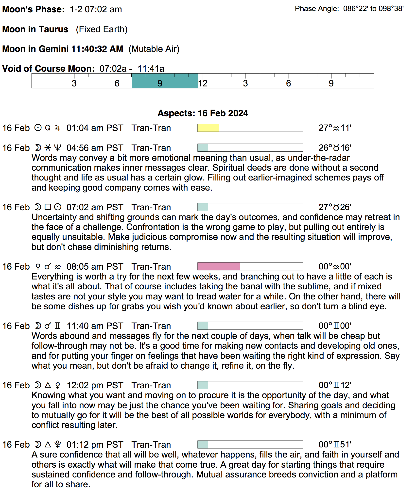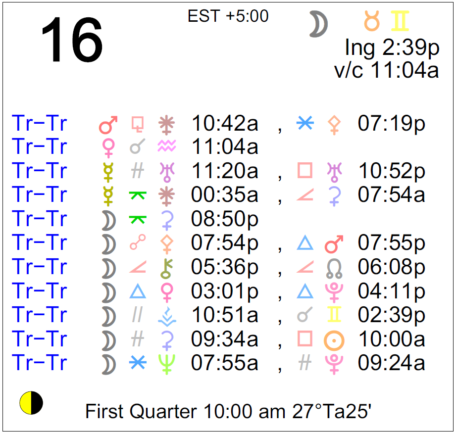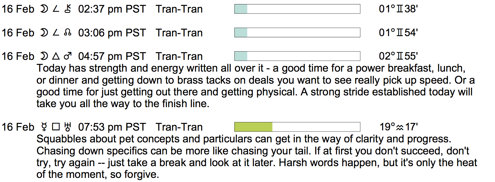 Planet Color Key: The longer the bar, the slower the aspecting planet, and the longer the duration of the planet’s transit.