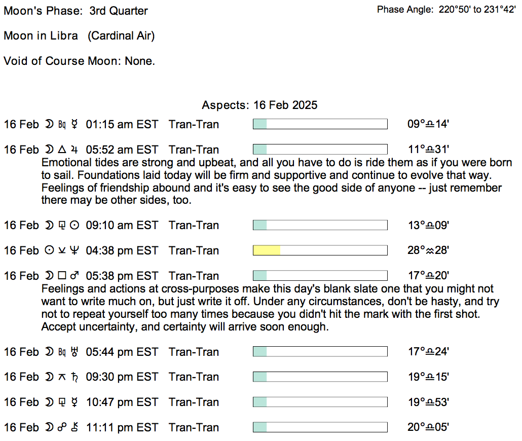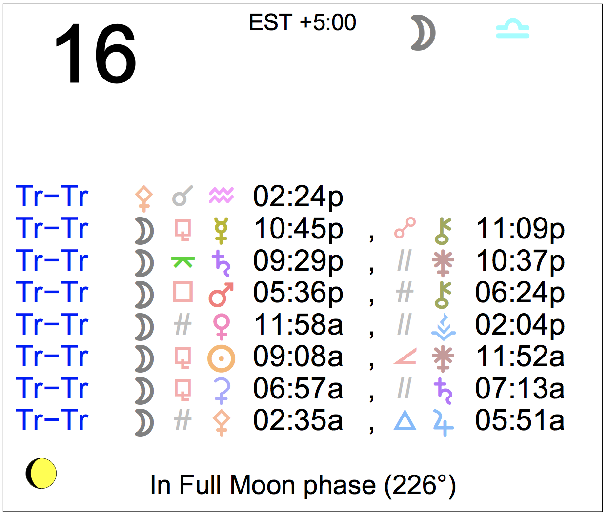 Planet Color Key: The longer the bar, the slower the aspecting planet, and the longer the duration of the planet’s transit.