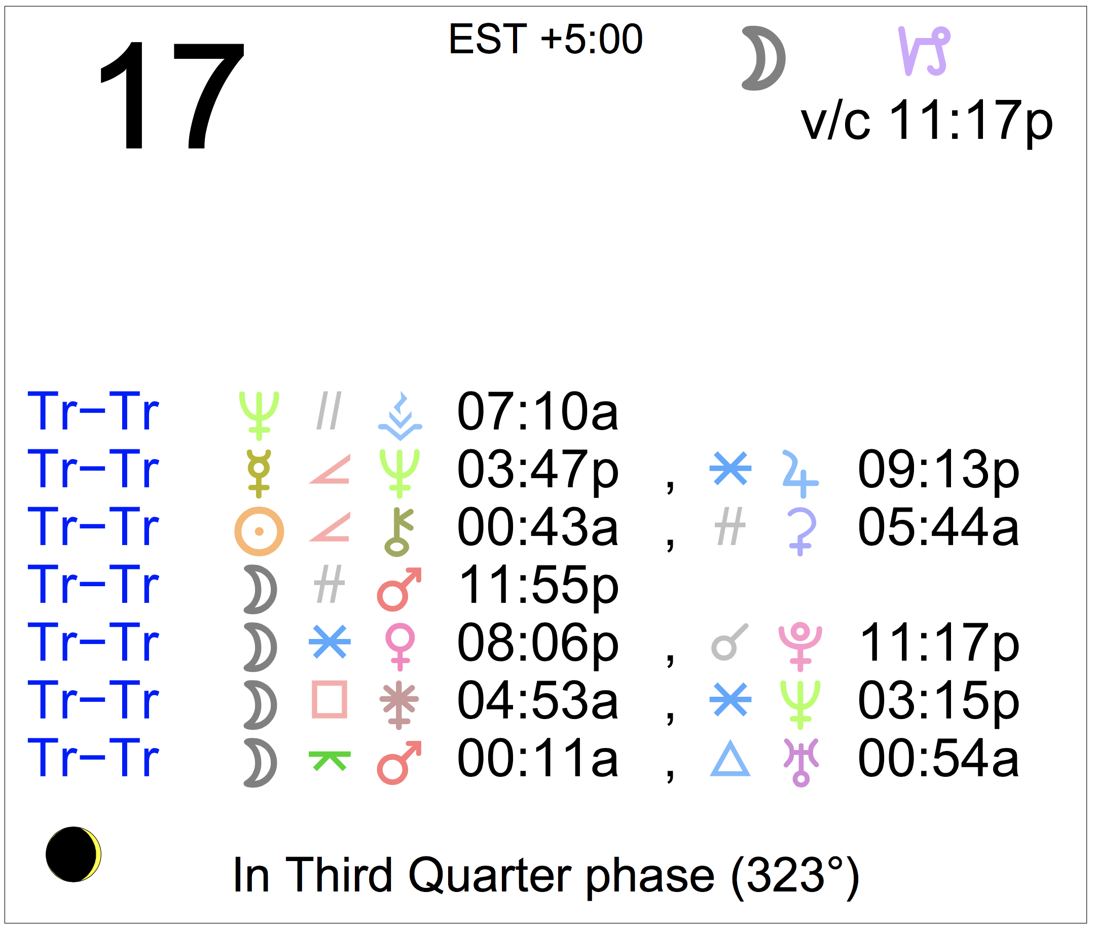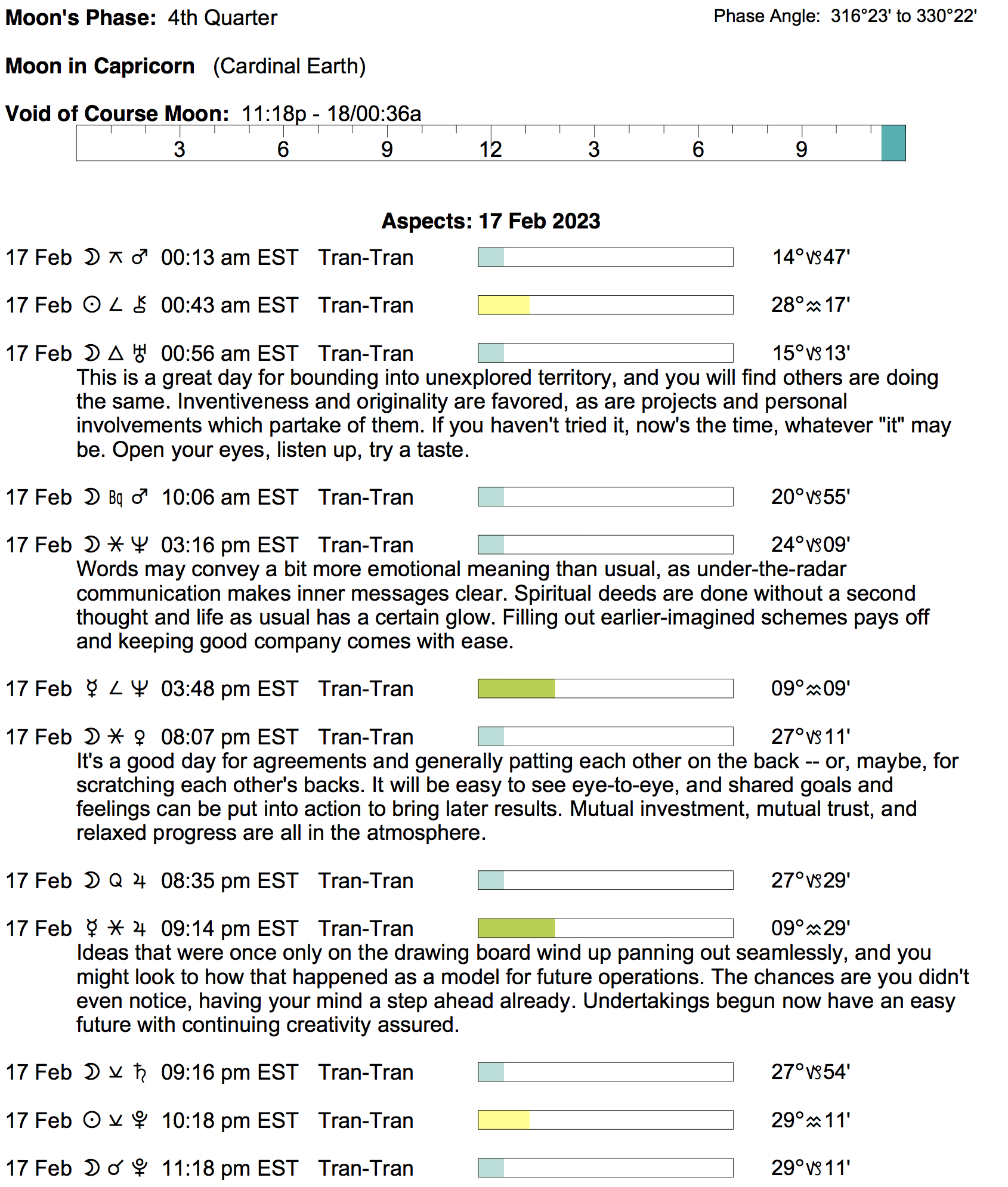 Planet Color Key: The longer the bar, the slower the aspecting planet, and the longer the duration of the planet’s transit.