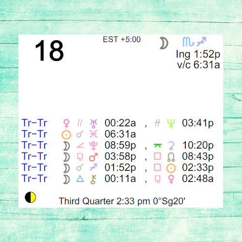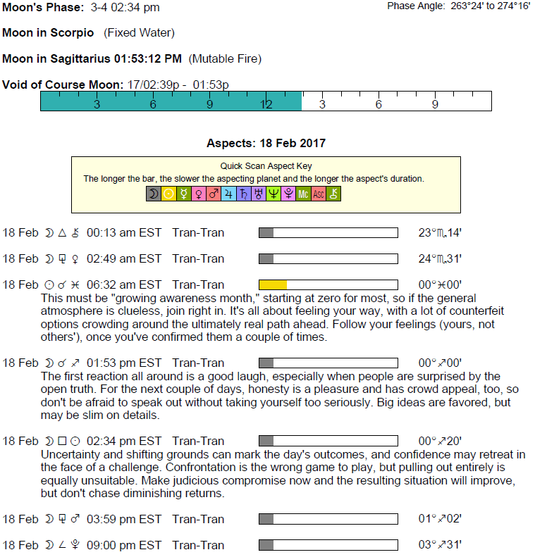 The following aspects (major only) and positions are at noon (EST) on February 18th: