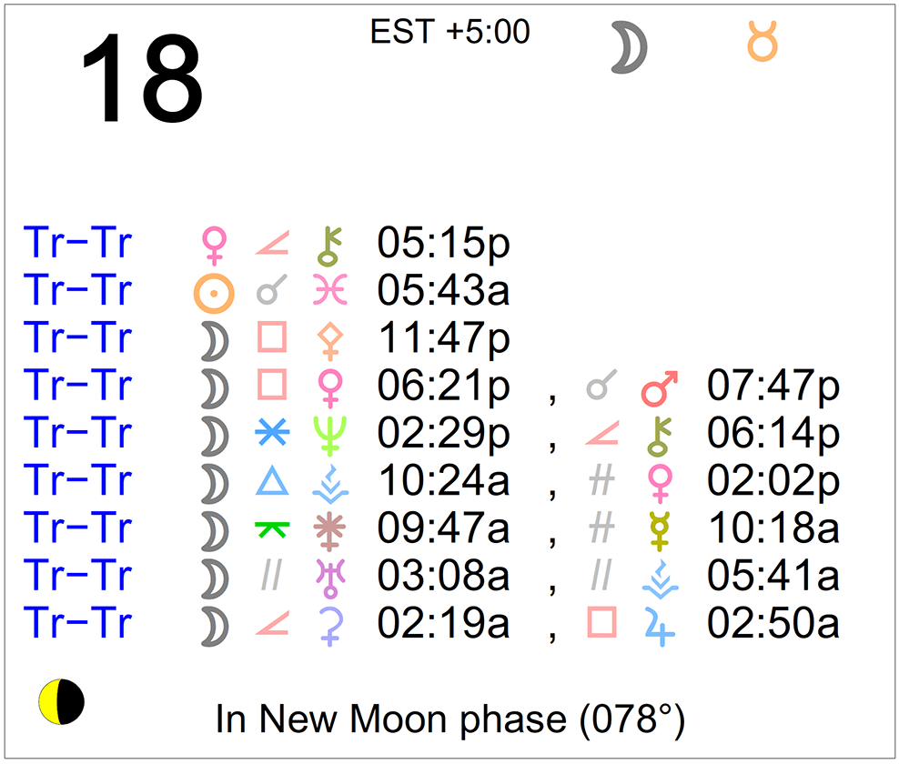 Planet Color Key: The longer the bar, the slower the aspecting planet, and the longer the duration of the planet’s transit.