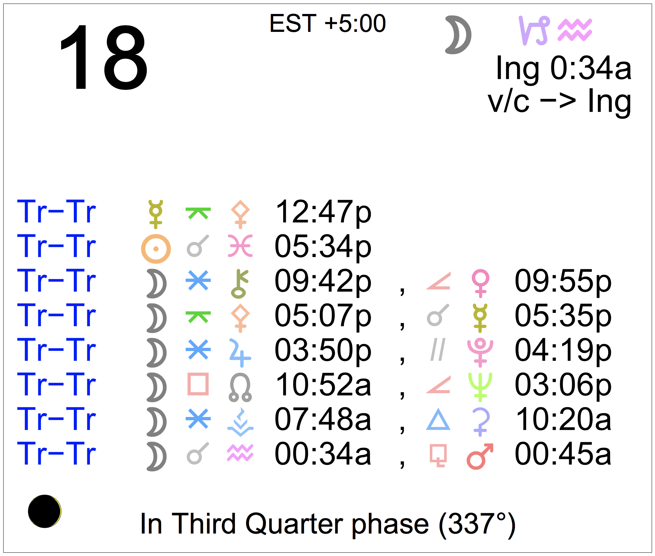 Planet Color Key: The longer the bar, the slower the aspecting planet, and the longer the duration of the planet’s transit.
