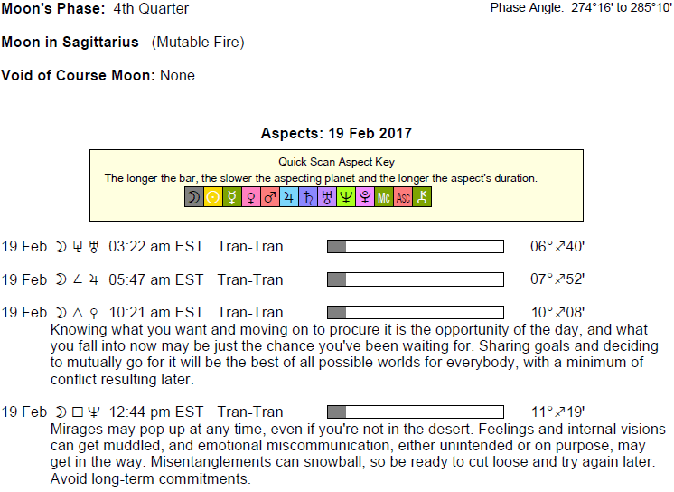 The following aspects (major only) and positions are at noon (EST) on February 19th: