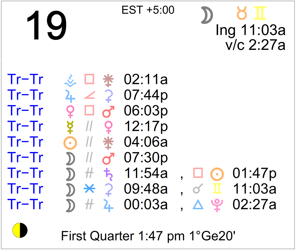 Planet Color Key: The longer the bar, the slower the aspecting planet, and the longer the duration of the planet’s transit.