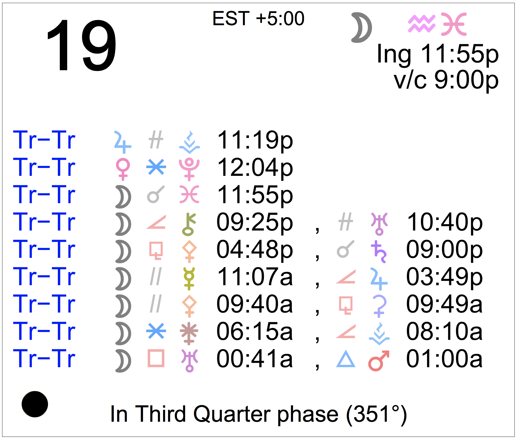 Planet Color Key: The longer the bar, the slower the aspecting planet, and the longer the duration of the planet’s transit.