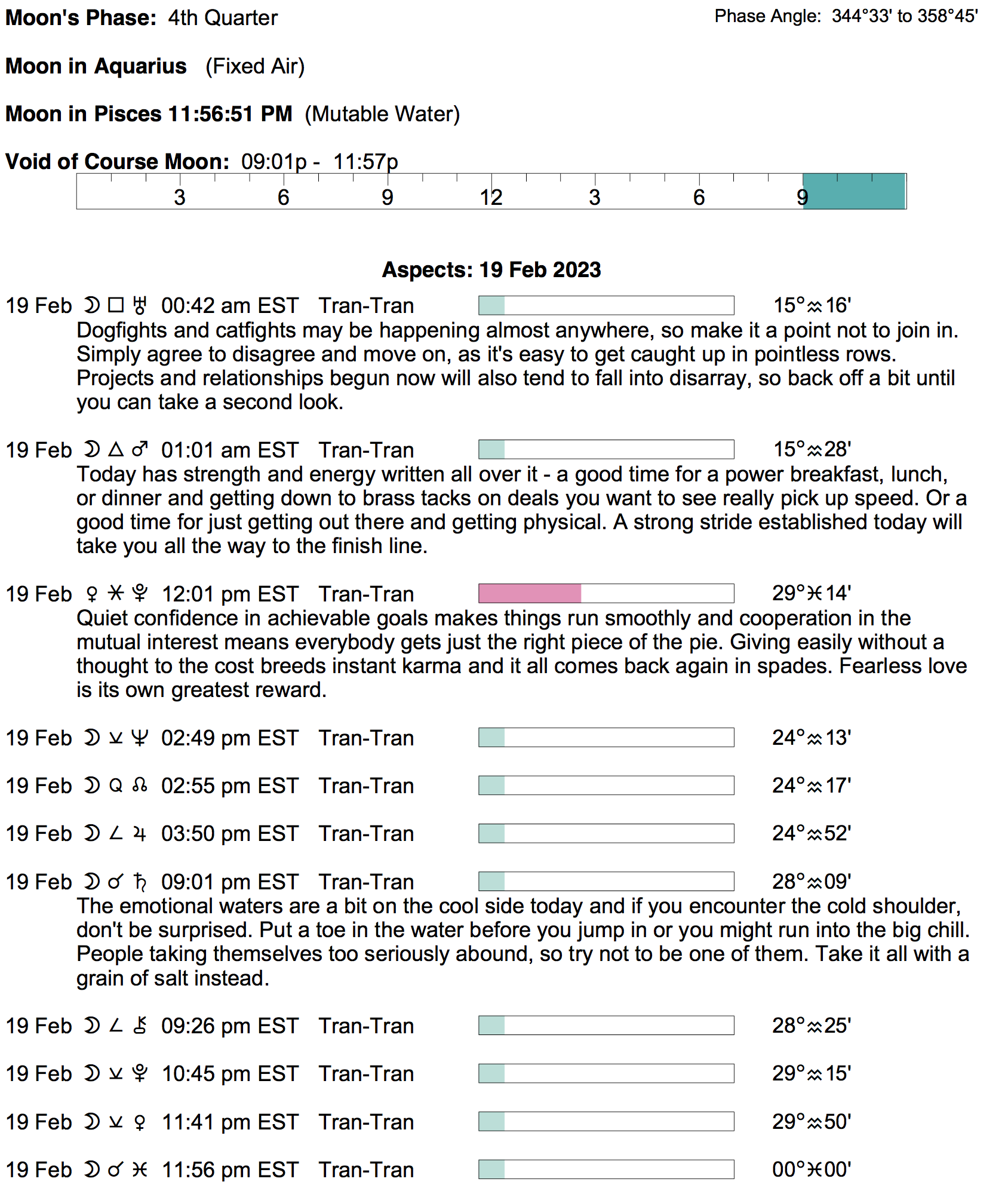 - The Moon is in Aquarius until 11:55 PM, after which the Moon is in Pisces.