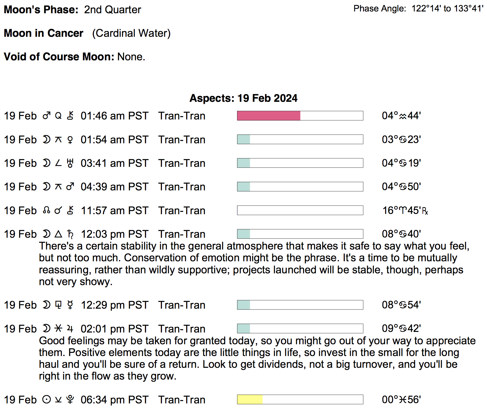Planet Color Key: The longer the bar, the slower the aspecting planet, and the longer the duration of the planet’s transit.
