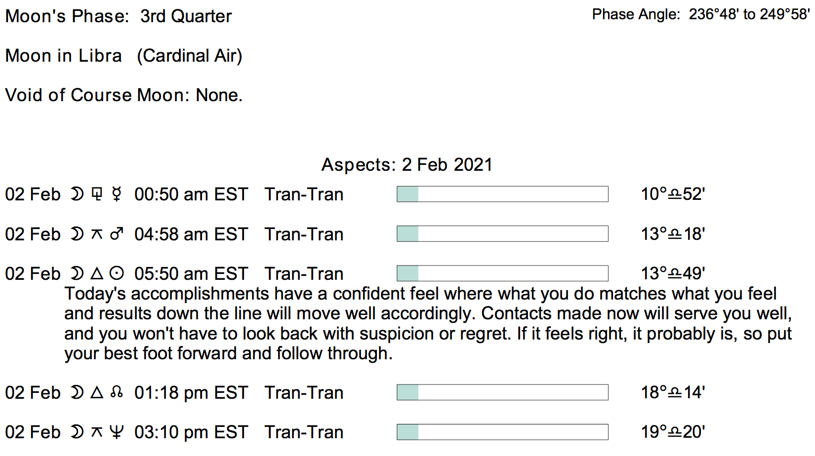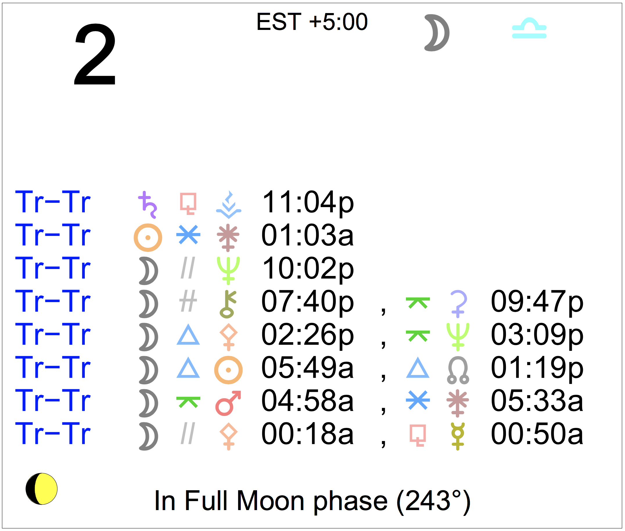 Planet Color Key: The longer the bar, the slower the aspecting planet, and the longer the duration of the planet’s transit.