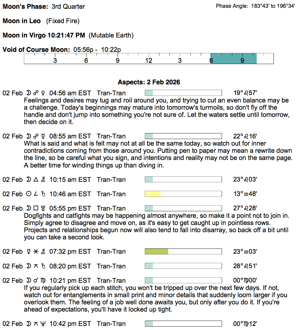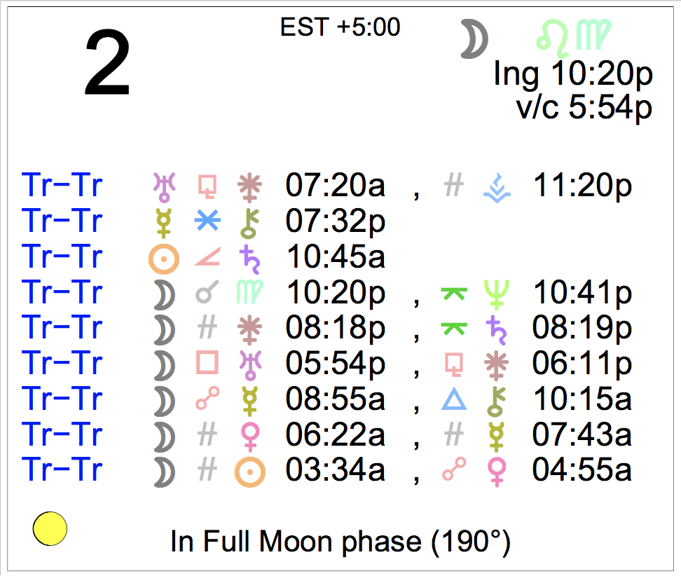 Planet Color Key: The longer the bar, the slower the aspecting planet, and the longer the duration of the planet’s transit.