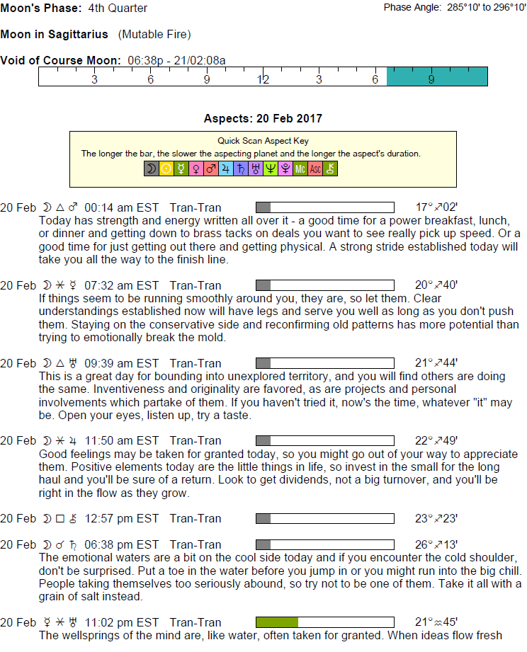 The following aspects (major only) and positions are at noon (EST) on February 20th:
