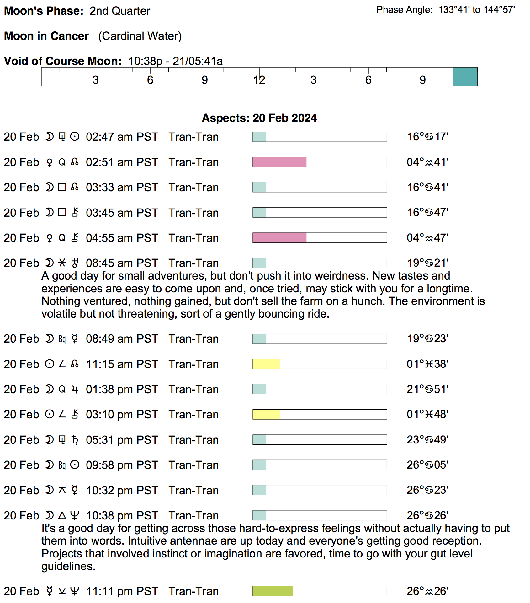 Planet Color Key: The longer the bar, the slower the aspecting planet, and the longer the duration of the planet’s transit.
