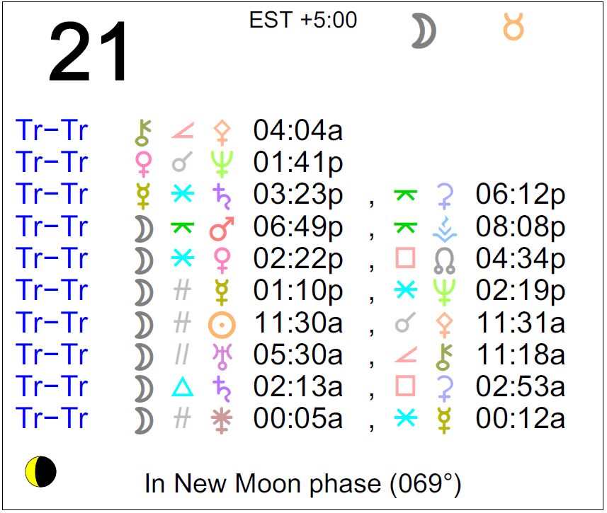 Planet Color Key: The longer the bar, the slower the aspecting planet and the longer the duration of the planet’s transit.