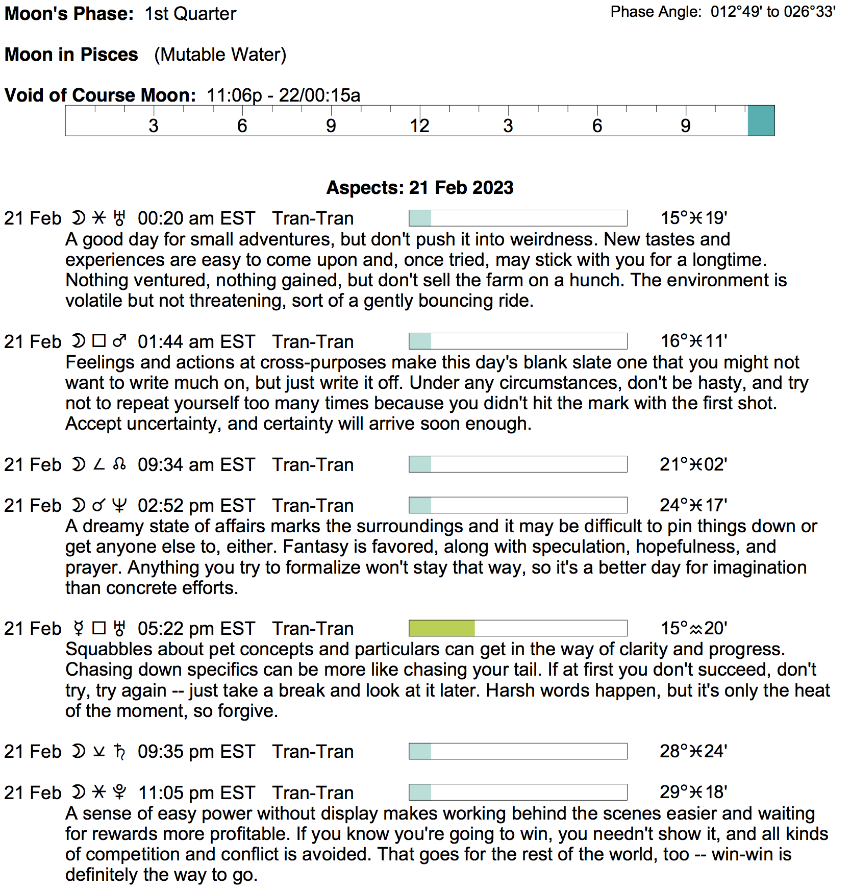 - A void Moon period begins tonight at 11:05 PM EST (until early tomorrow at 12:13 AM).