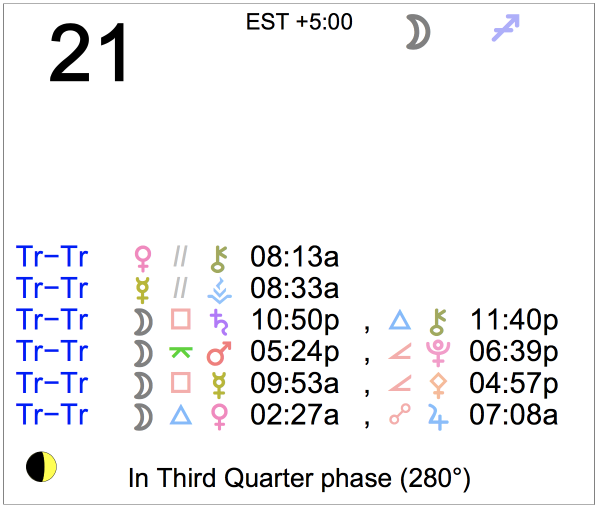 Planet Color Key: The longer the bar, the slower the aspecting planet, and the longer the duration of the planet’s transit.