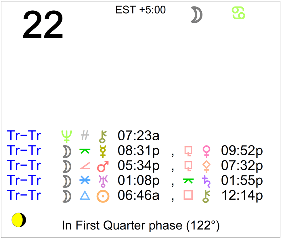 Planet Color Key: The longer the bar, the slower the aspecting planet, and the longer the duration of the planet’s transit.
