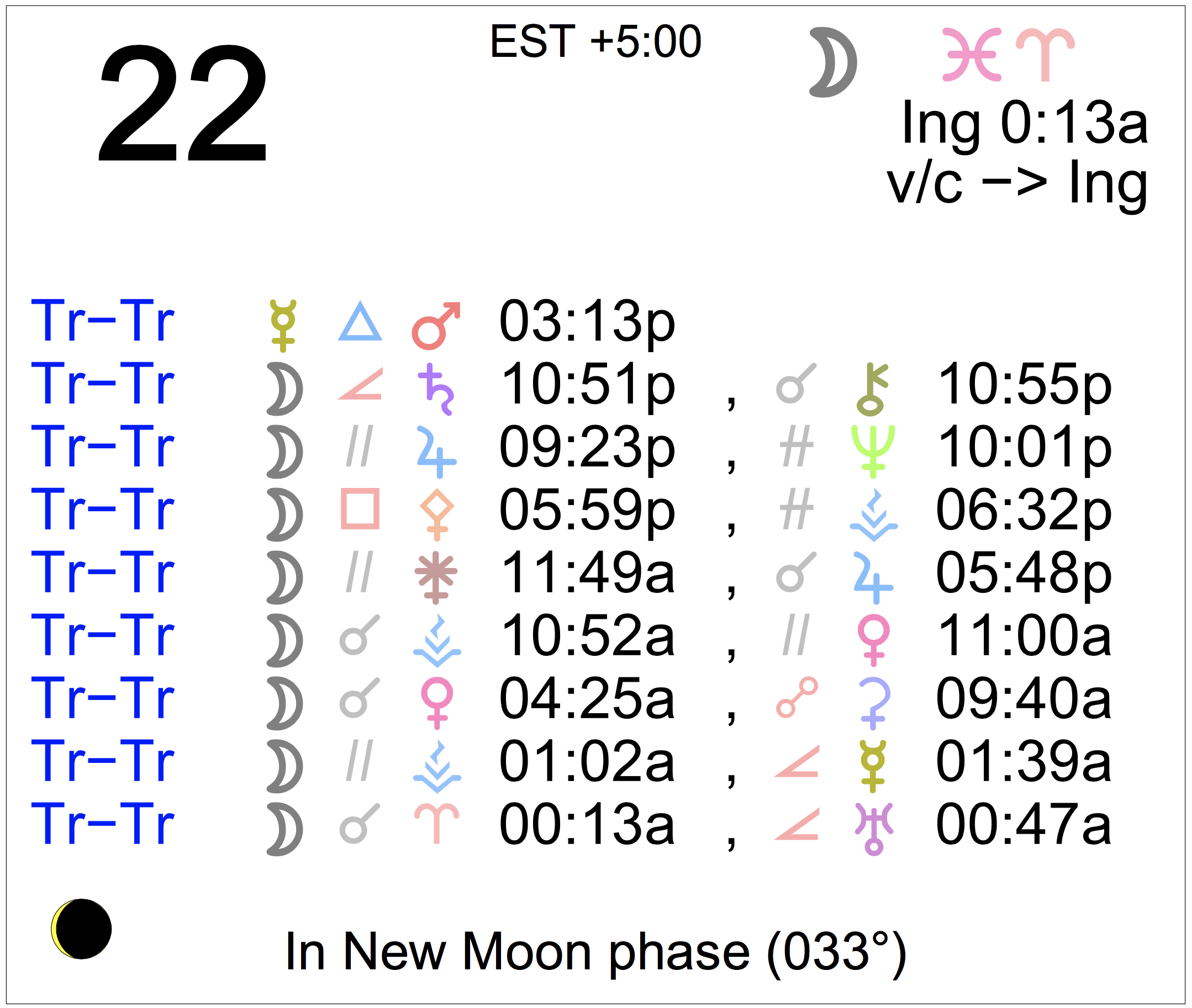 - A void Moon period continues until 12:13 AM (since yesterday at 11:05 PM EST).