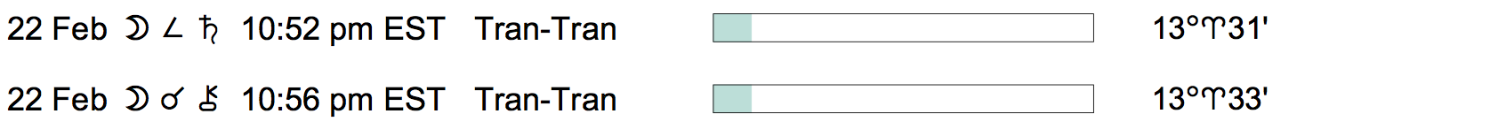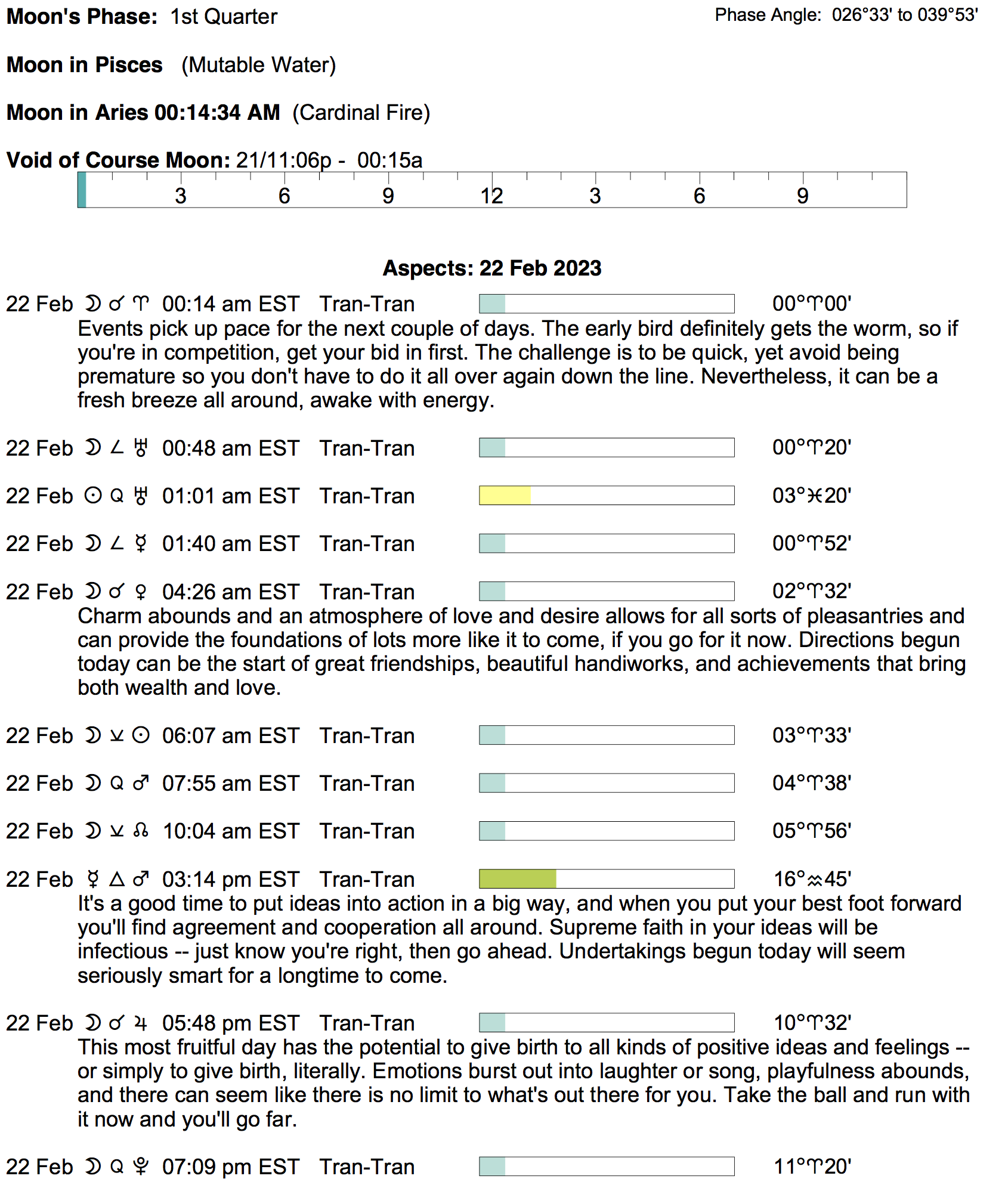Planet Color Key: The longer the bar, the slower the aspecting planet, and the longer the duration of the planet’s transit.