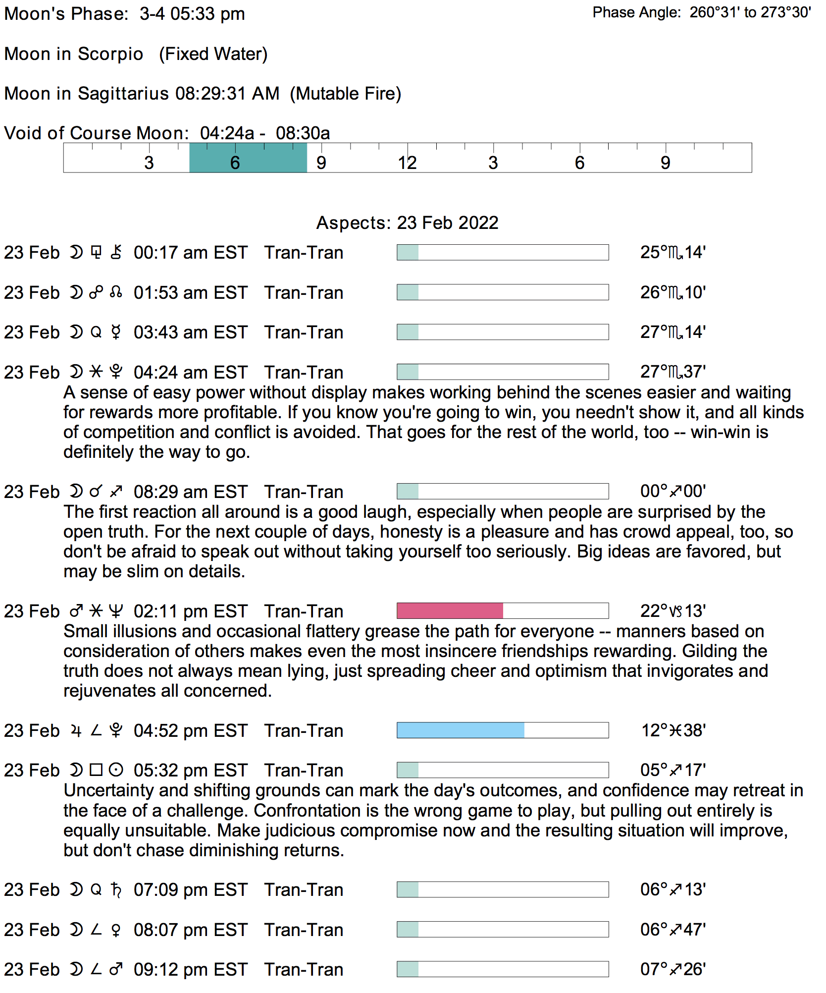 Planet Color Key: The longer the bar, the slower the aspecting planet, and the longer the duration of the planet’s transit.