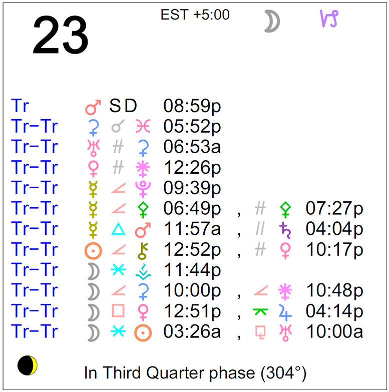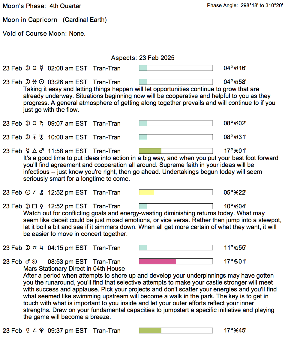 Planet Color Key: The longer the bar, the slower the aspecting planet, and the longer the duration of the planet’s transit.