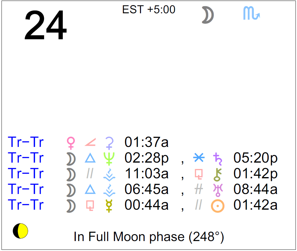Planet Color Key: The longer the bar, the slower the aspecting planet and the longer the duration of the planet’s transit.