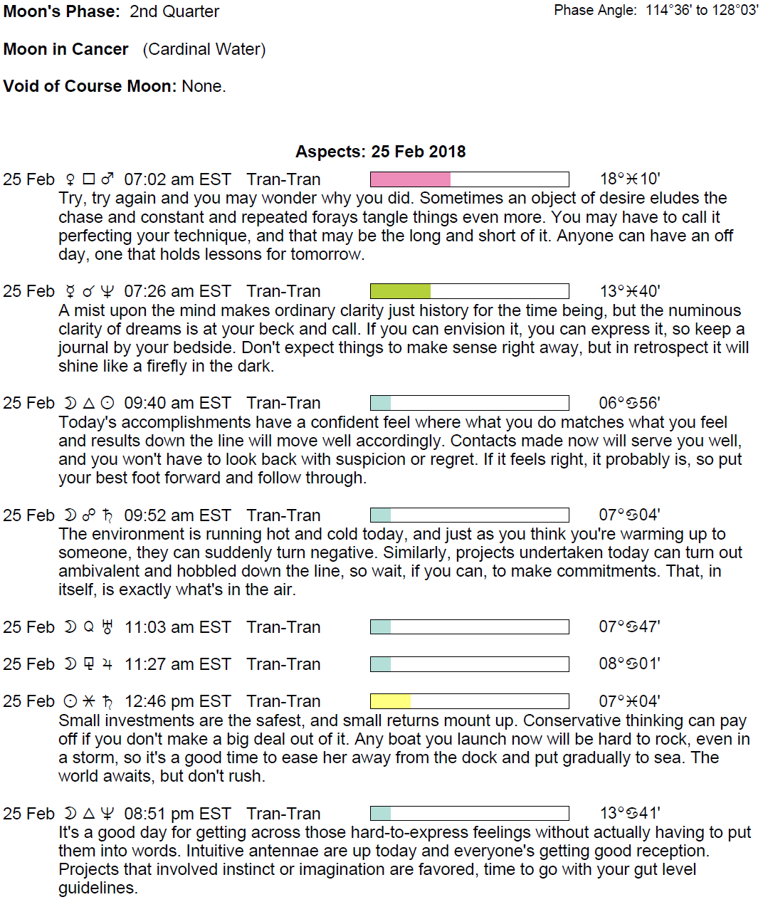 Planet Color Key: The longer the bar, the slower the aspecting planet and the longer the duration of the planet’s transit.