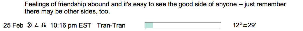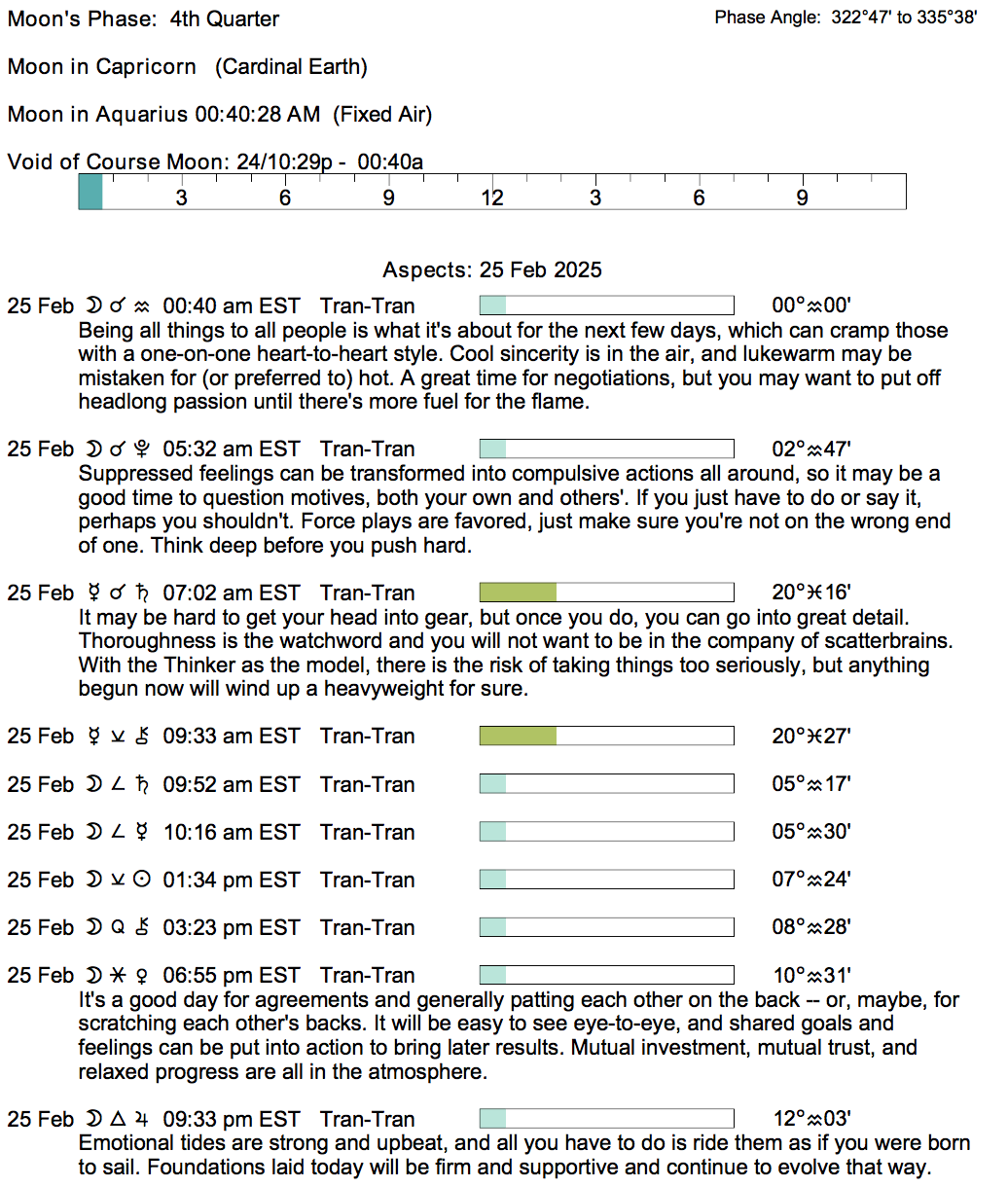 Planet Color Key: The longer the bar, the slower the aspecting planet, and the longer the duration of the planet’s transit.