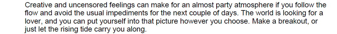 We are less inhibited and more willing to indulge ourselves. Love and romance can be favorable. Decorating, beauty treatments, the arts, creative pursuits, parties, dates, and recreation are generally favored now. There is increased sensitivity, affection, and warmth. Love is grand! Affection, love, and romance are in the air.