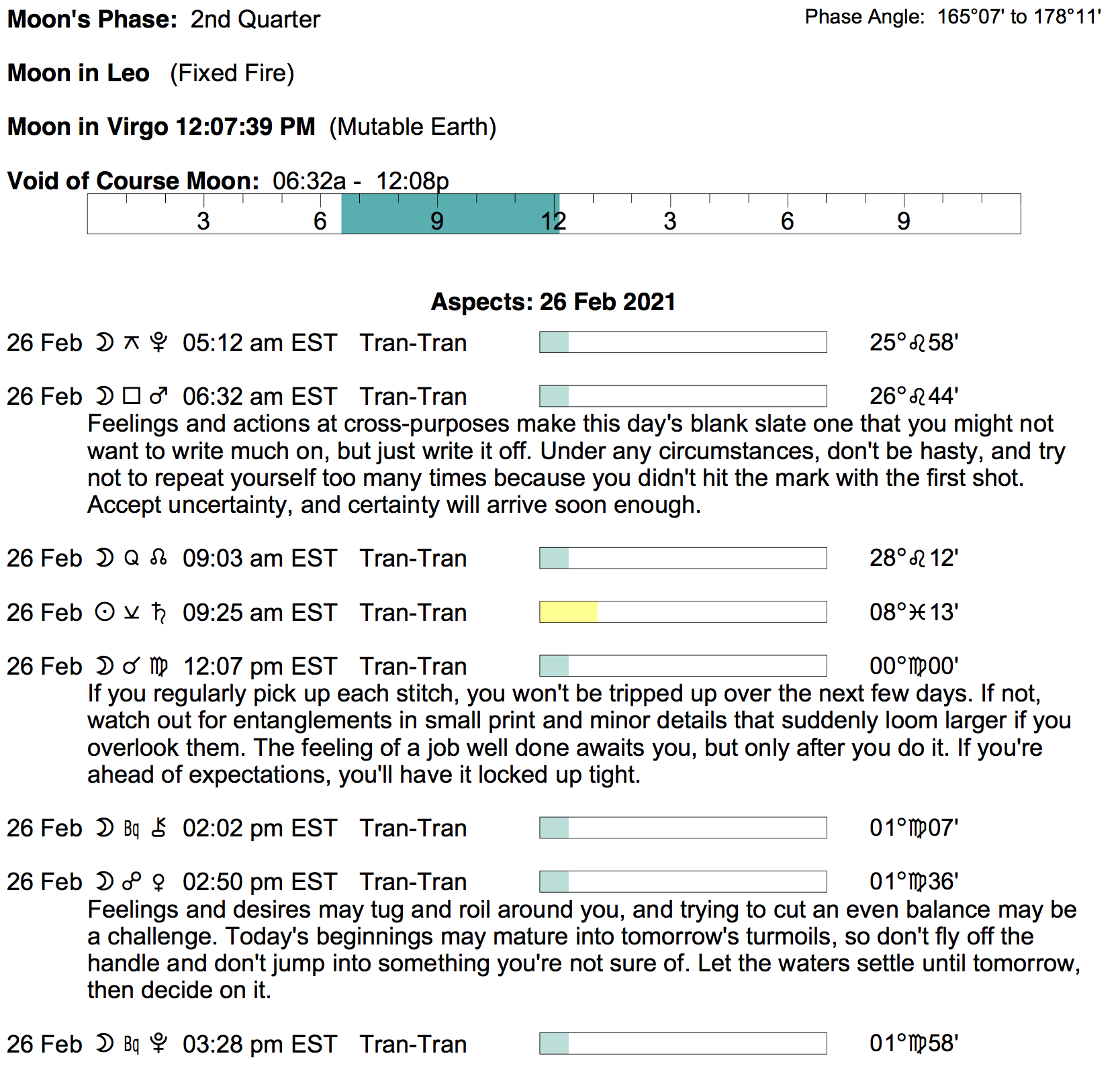 Planet Color Key: The longer the bar, the slower the aspecting planet, and the longer the duration of the planet’s transit.