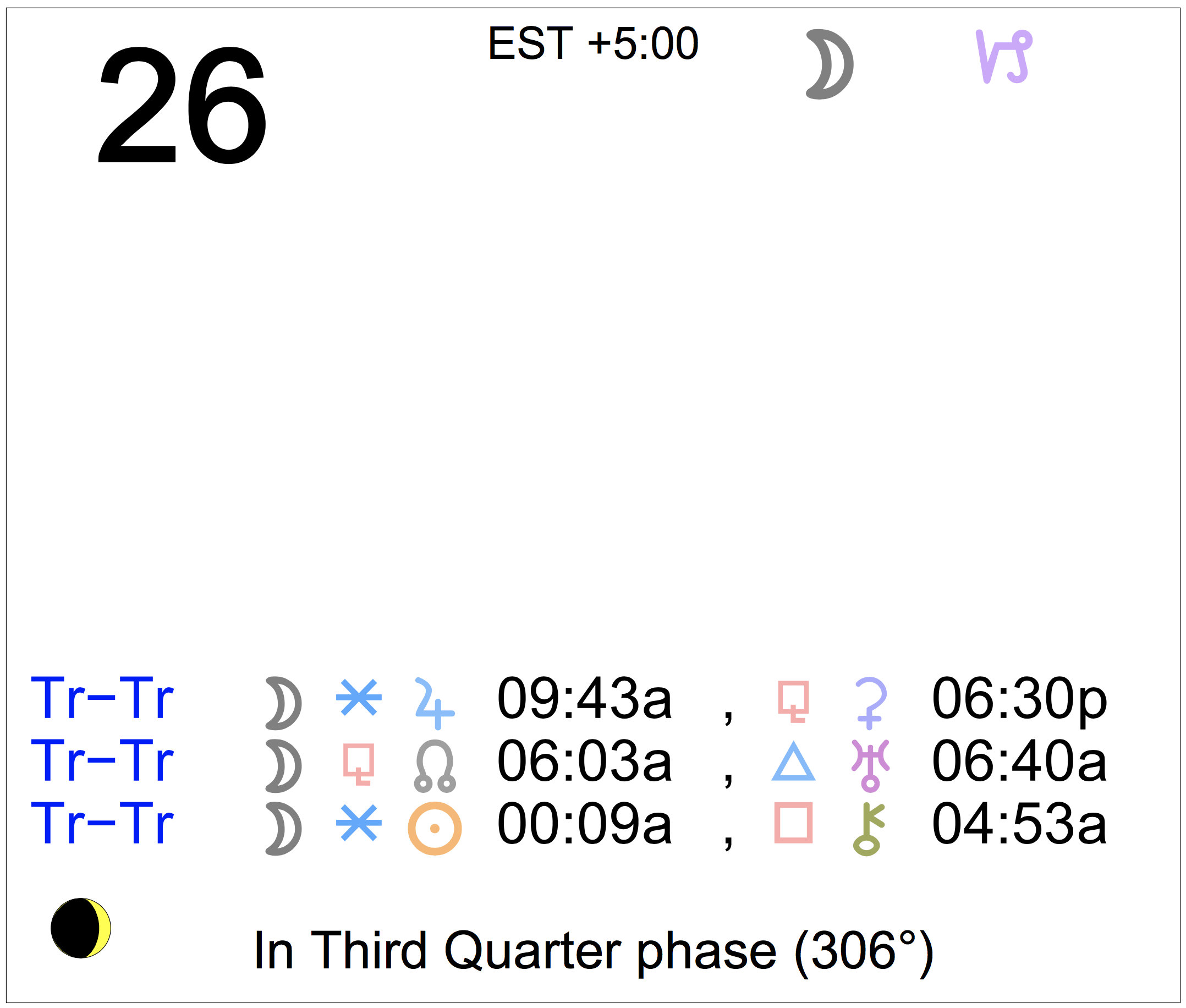 Planet Color Key: The longer the bar, the slower the aspecting planet, and the longer the duration of the planet’s transit.