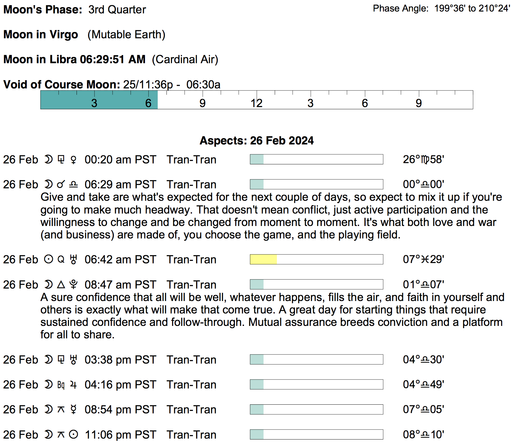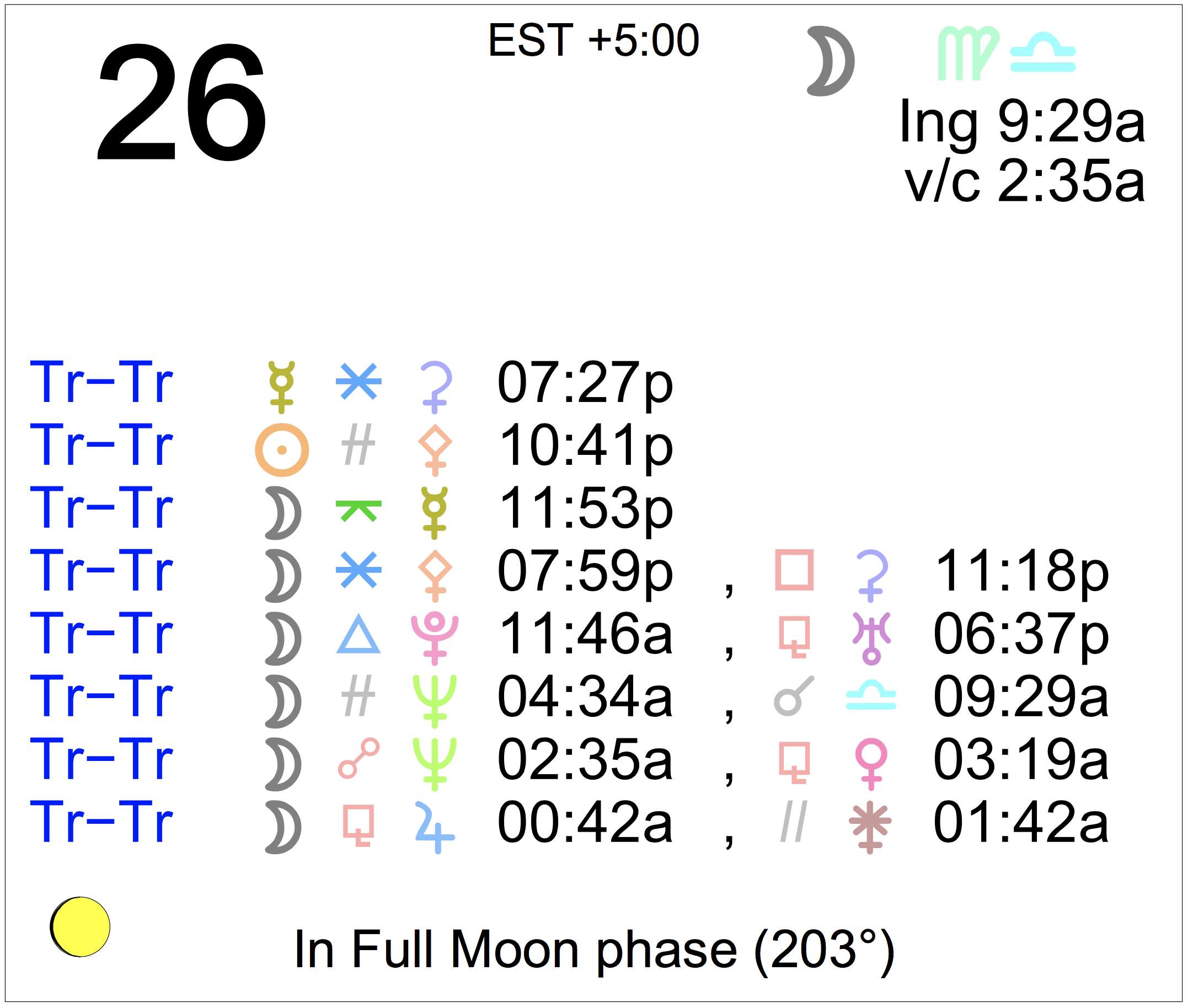 Planet Color Key: The longer the bar, the slower the aspecting planet, and the longer the duration of the planet’s transit.