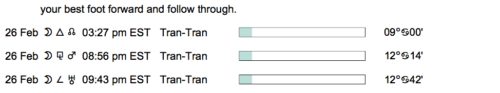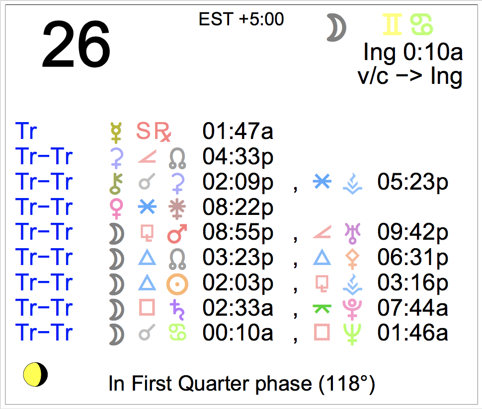 Planet Color Key: The longer the bar, the slower the aspecting planet, and the longer the duration of the planet’s transit.